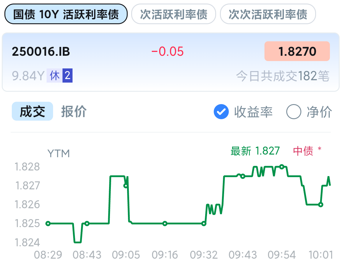 十年期国债收益率:1.827%,-0.05BP(国债收益率越跌,债市越涨)