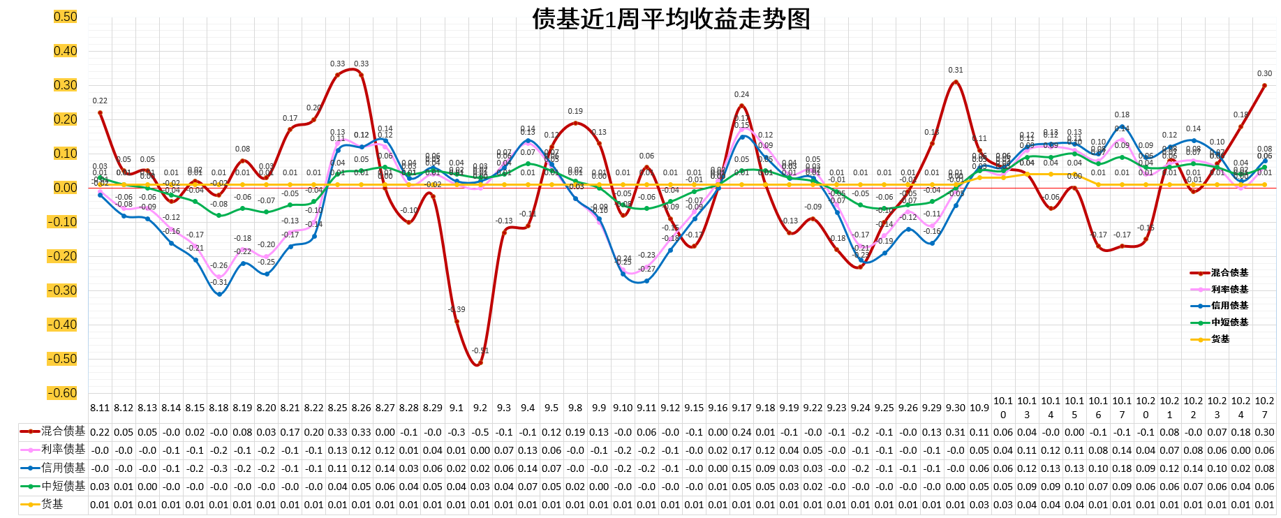 3、近1周平均收益排序:混合债基>信用债基>中短债基=利率债基>货基。