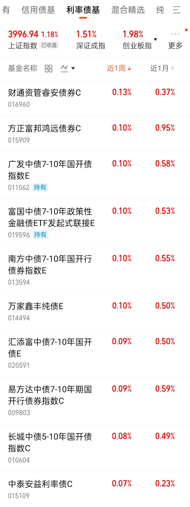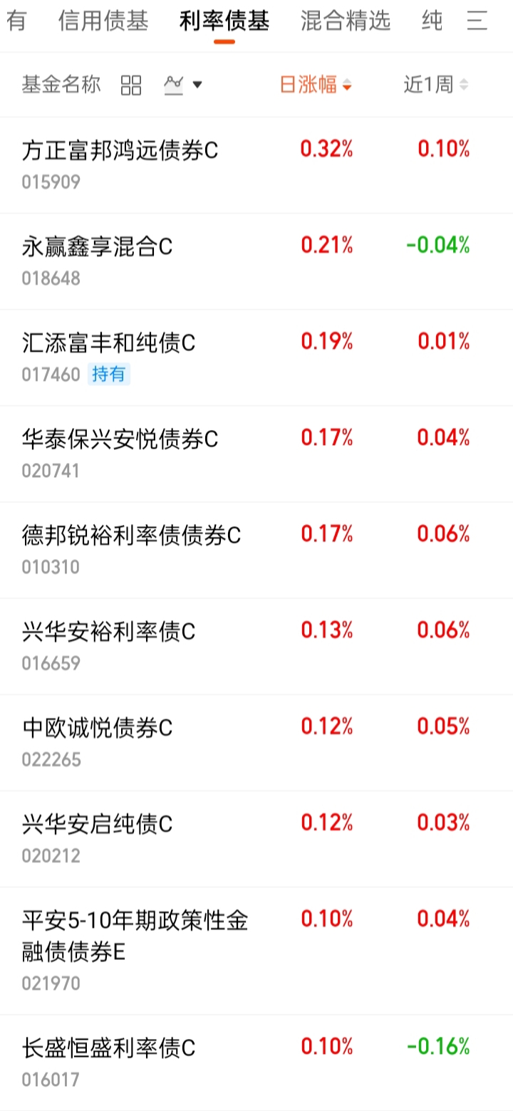 $华泰保兴安悦债券C(OTCFUND|020741)$。$东方添益债券(OTCFUND|400030)$。$华泰保兴安悦债券A(OTCFUND|007540)$ 。$鹏华丰禄债券(OTCFUND|003547)$。$方正富邦鸿远债券C(OTCFUND|015909)$。$永赢稳健增强债券C(OTCFUND|014089)$。$国泰惠丰纯债债券A(OTCFUND|007214)$。$博时恒乐债券C(OTCFUND|014847)$。$易方达增强回报债券A(OTCFUND|110017)$。$南方中债7-10年国开行债券指数E(OTCFUND|013594)$