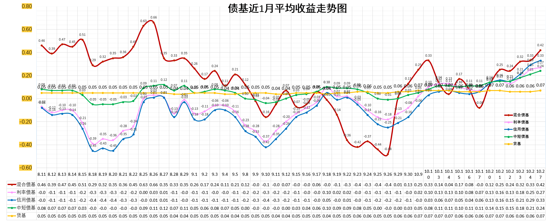 5、债基近1 周平均收益与前一天相比大幅上升。 债基近1 月平均收益与前一天相比小幅上升。混合债基近1周平均收益与前一天相比大幅上升。