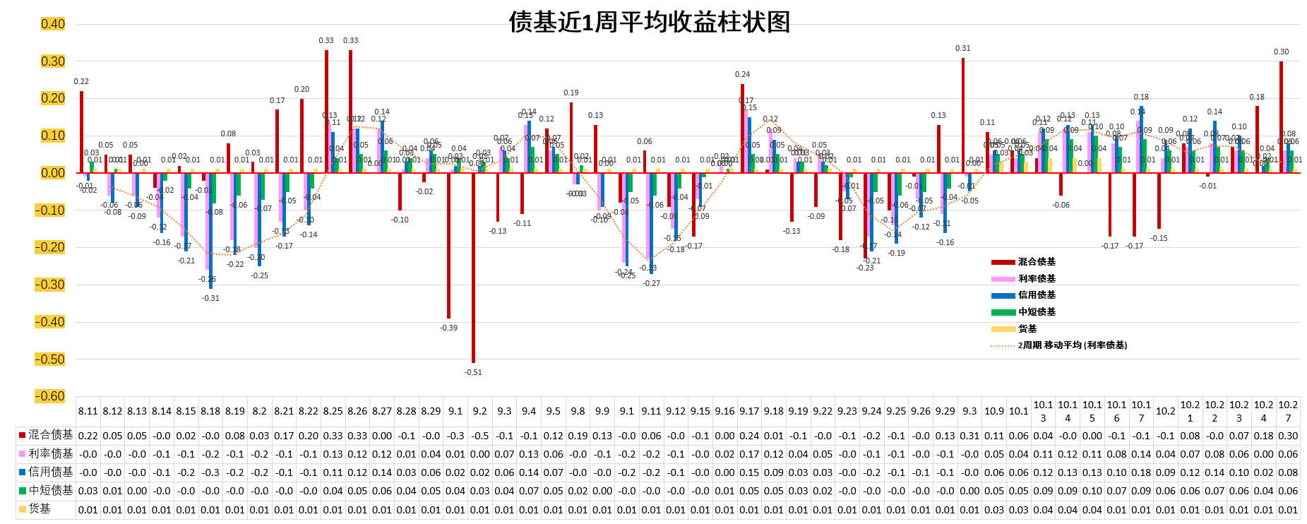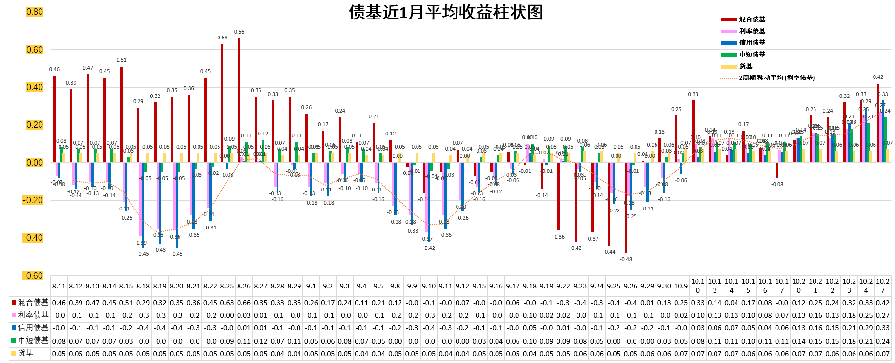 2、混合债基近1周平均收益高于货基,高于债基。利率债基近1周平均收益低于信用债基。
