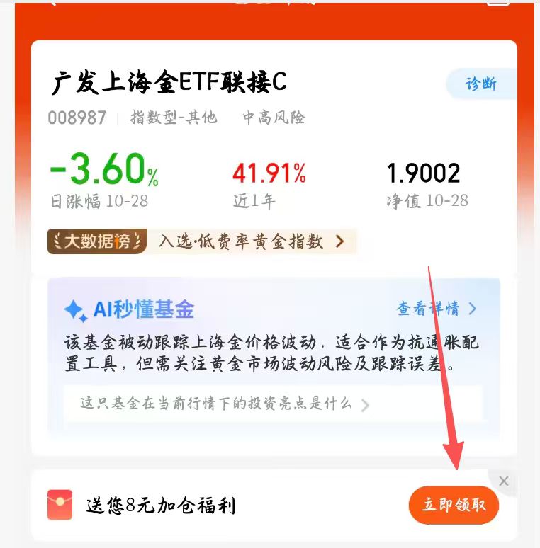 黄金这两天回调比较多,司机今天逢低买入5000元广发上海金,它在7免上海金里是热度最高的,近1个月、3个月、半年业绩比国泰黄金好一些,司机准备后期逐渐转到这边。