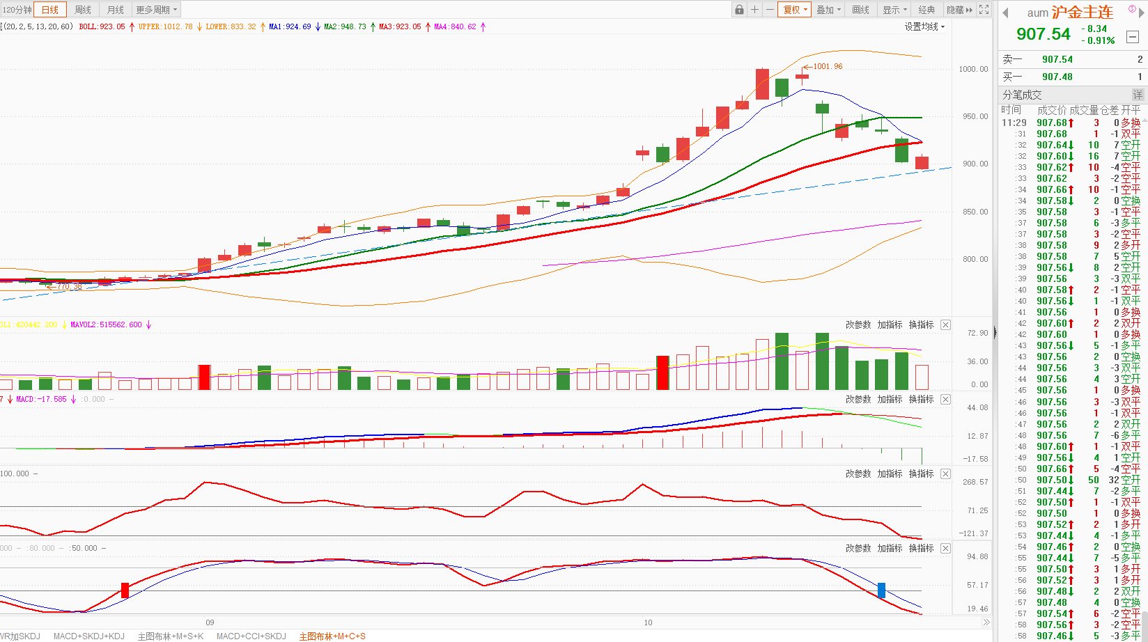 沪金主连:跌0.91%,日K线在5日均线之下。今天沪金下跌 ,日K线在探低前期上升趋势线后回升,目前技术指标已到达低位,整体跌幅也不小了,随时可能出现技术性反弹,今天司机准备逢低适量买入。
