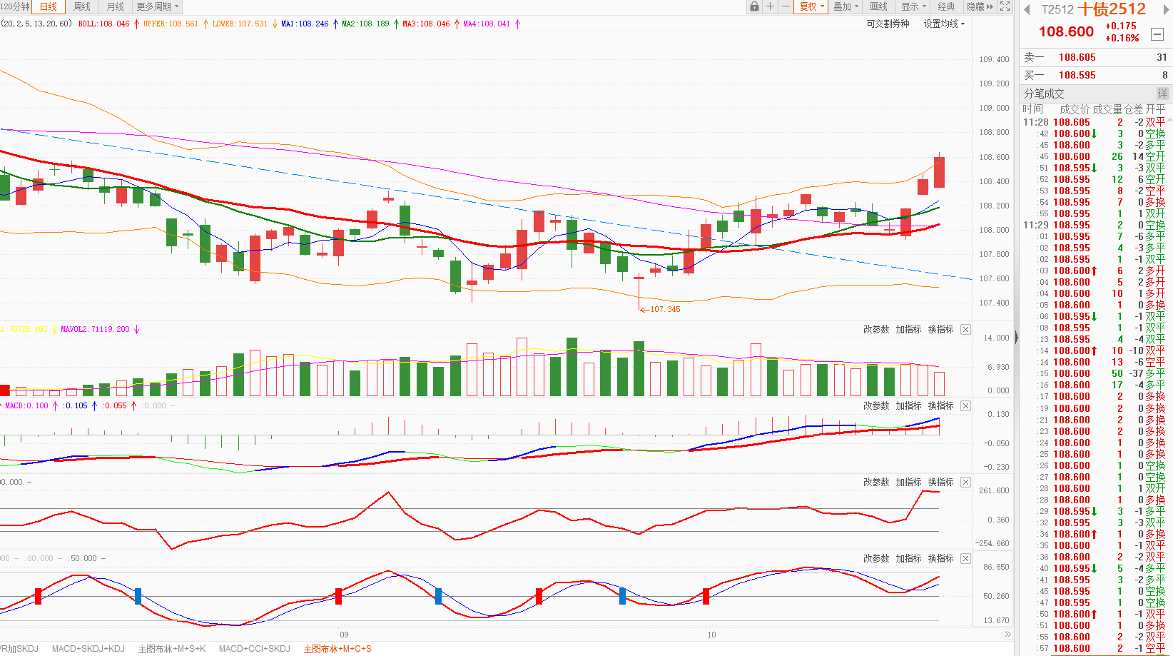 今天国债期货日K线收盘后全部在5日均线之上,整体低开高走,走势较强。