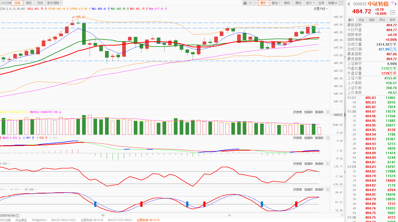 中证转债:涨0.06%,日K线在5日均线之下,KDJ金叉,MACD金叉红柱缩短。今天中证转债上涨,日K线冲高回落,在大盘下跌的情况下仍能保持红盘挺不容易,后市可能继续震荡。