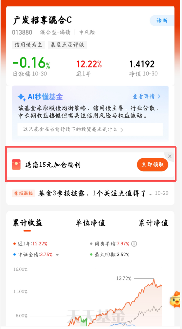 广发招享近期开始反攻,整体涨多跌少,修复速度很快。目前债市已企稳回暖,股市仍处上升趋势,混债凭借股债双升的势头,后市可能有更佳的表现,司机今天买入1000元。
