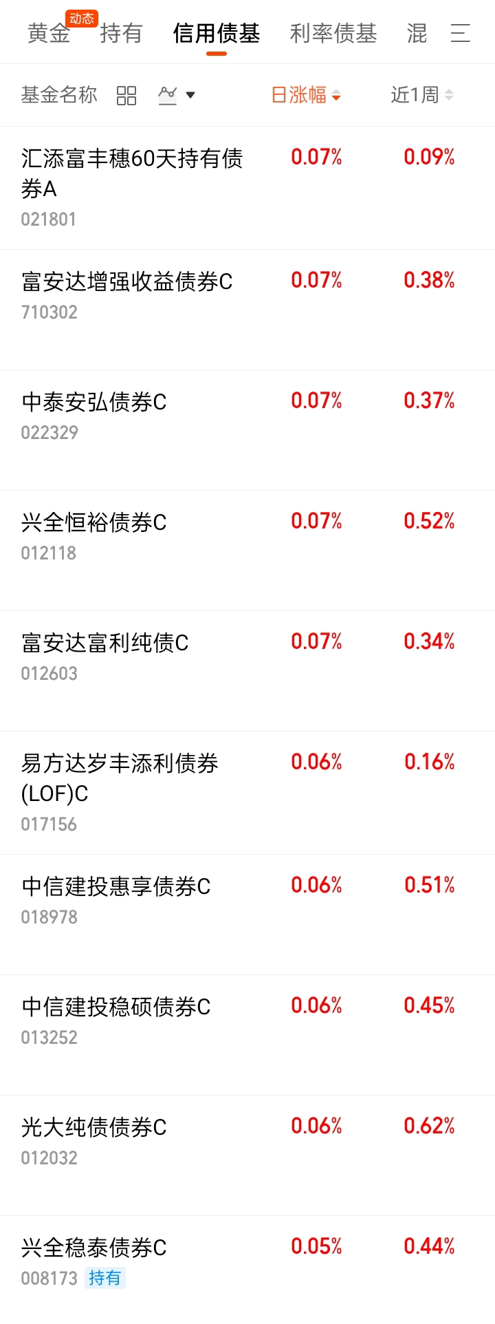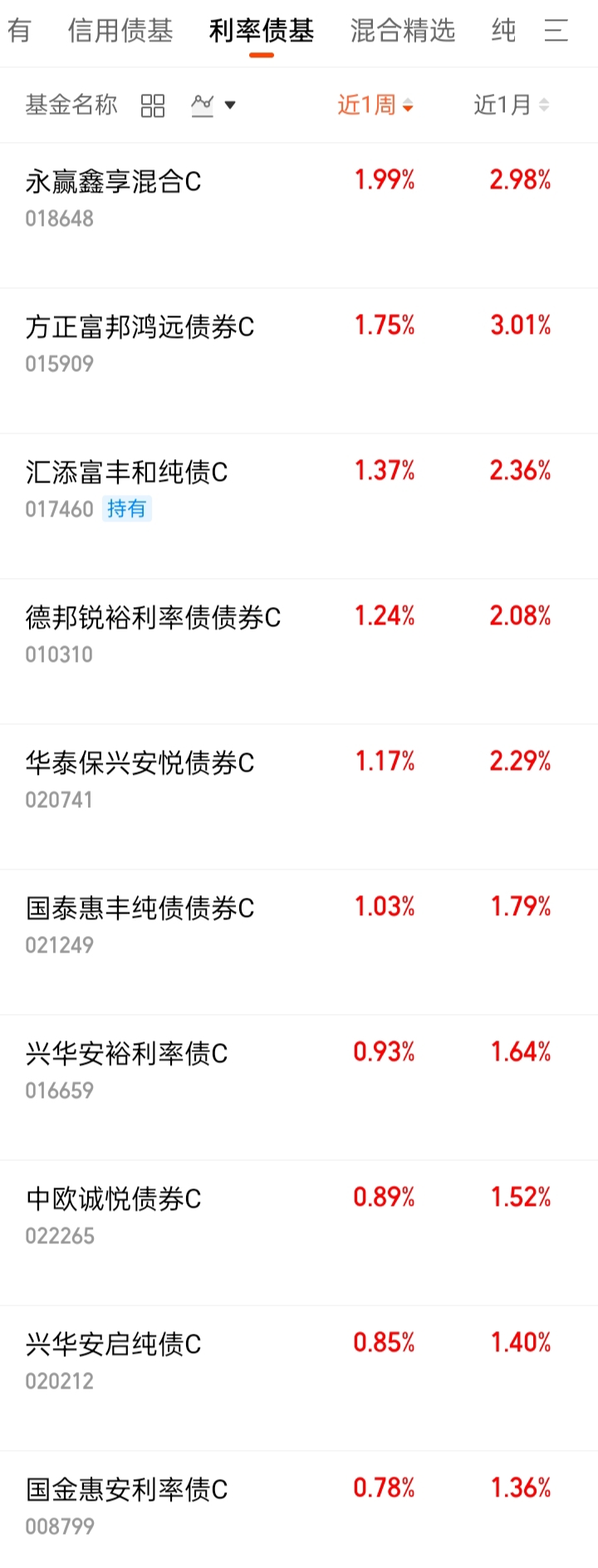 $华泰保兴安悦债券C(OTCFUND|020741)$。$东方添益债券(OTCFUND|400030)$。$华泰保兴安悦债券A(OTCFUND|007540)$ 。$鹏华丰禄债券(OTCFUND|003547)$。$方正富邦鸿远债券C(OTCFUND|015909)$。$永赢稳健增强债券C(OTCFUND|014089)$。$国泰惠丰纯债债券A(OTCFUND|007214)$。$博时恒乐债券C(OTCFUND|014847)$。$易方达增强回报债券A(OTCFUND|110017)$。$南方中债7-10年国开行债券指数E(OTCFUND|013594)$