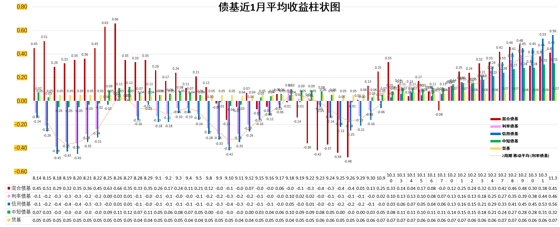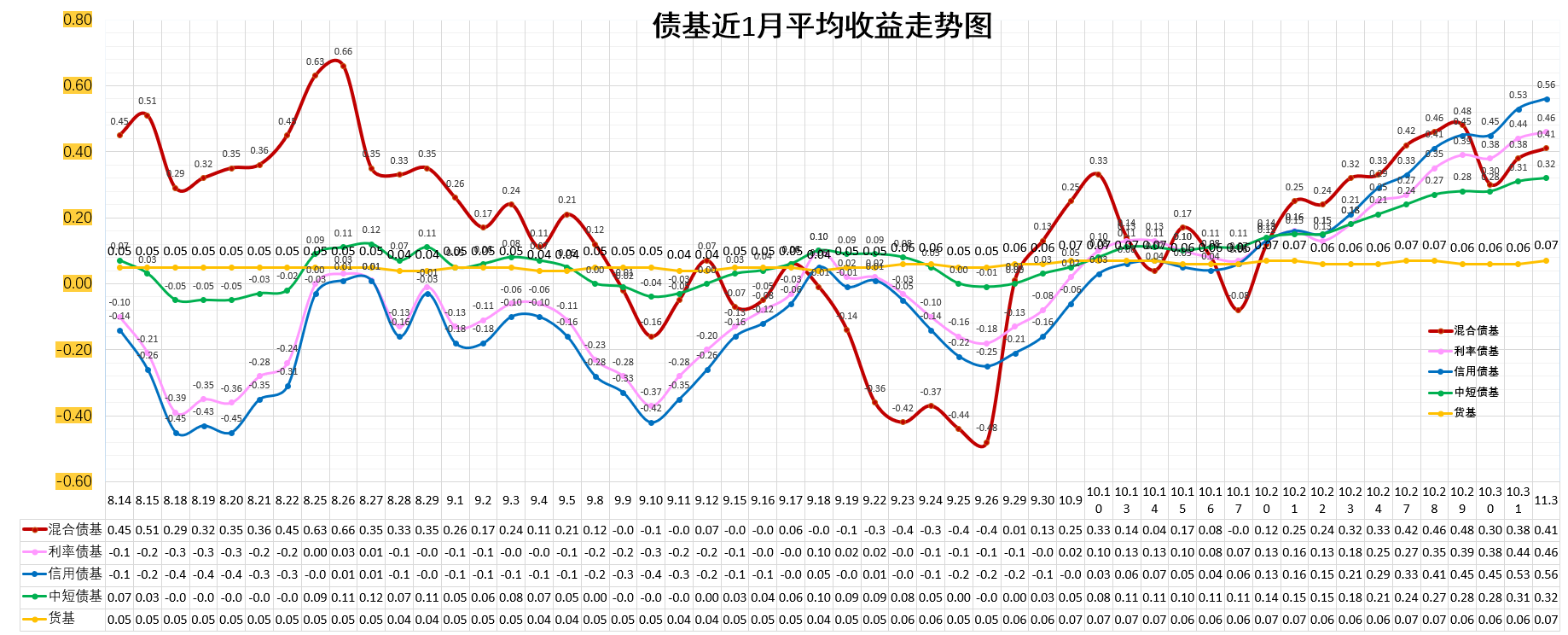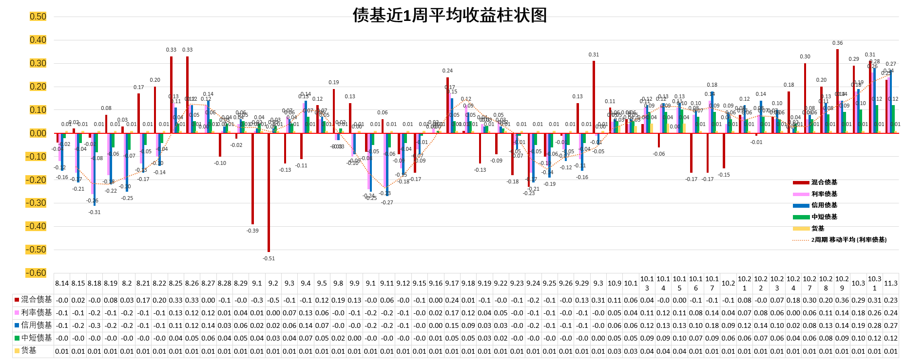 2、混合债基近1周平均收益高于货基,低于债基。利率债基近1周平均收益低于信用债基。