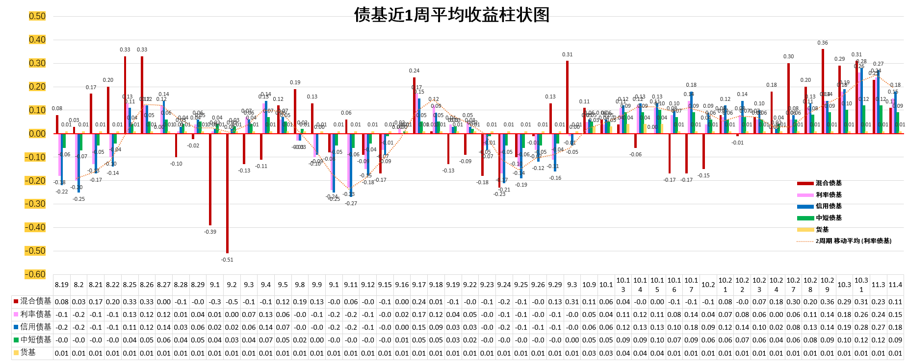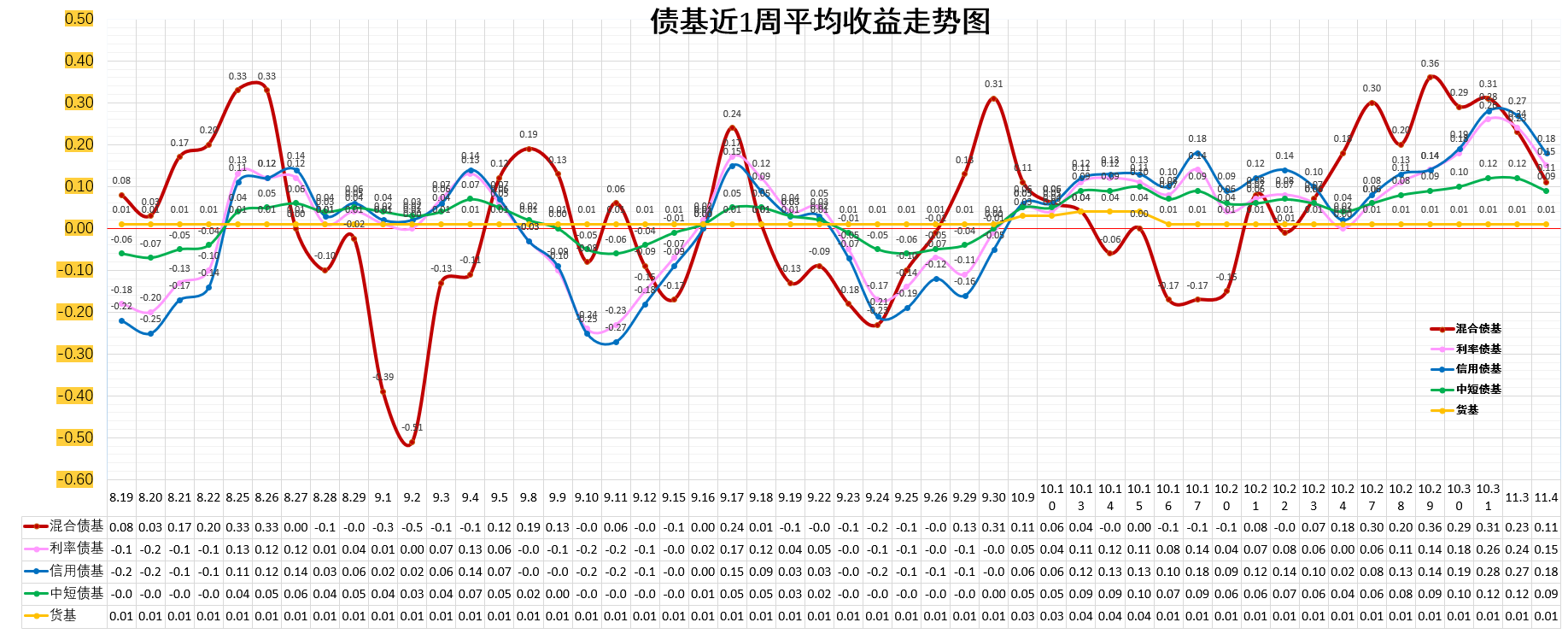 2、混合债基近1周平均收益高于货基,低于债基。利率债基近1周平均收益低于信用债基。