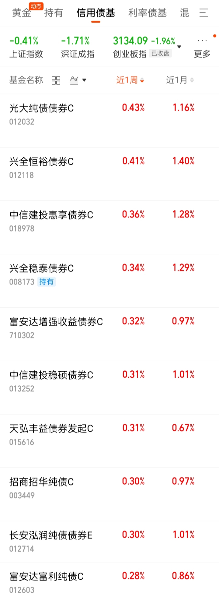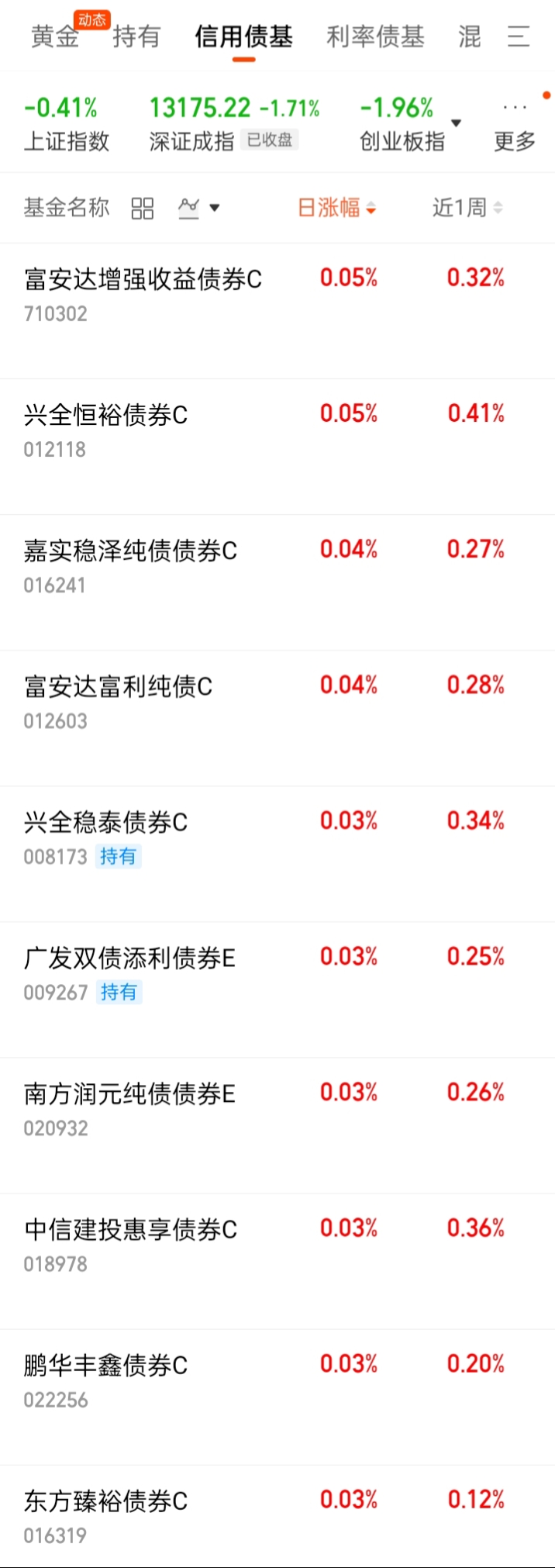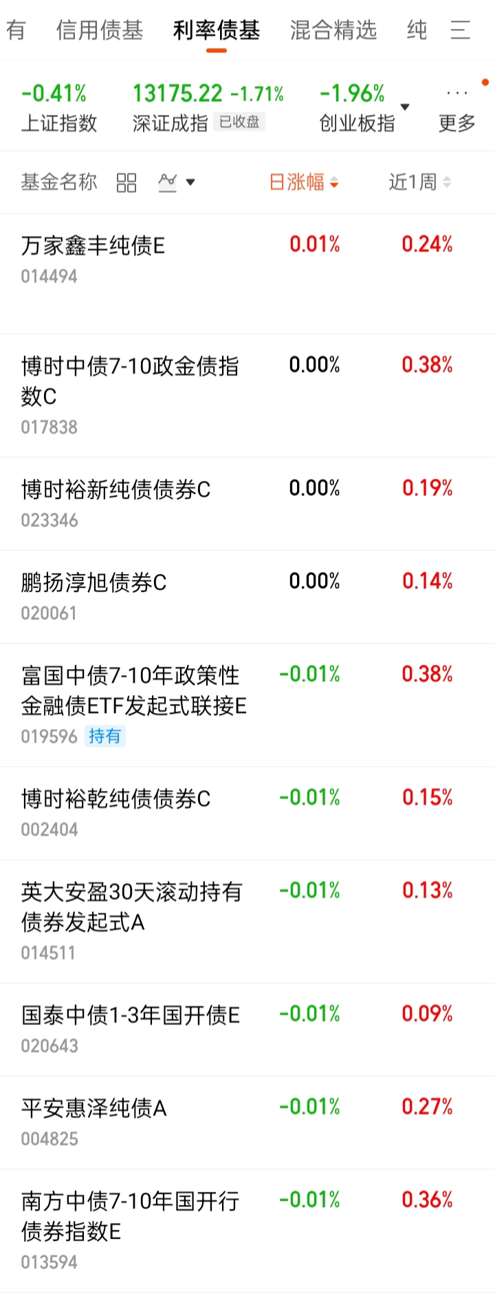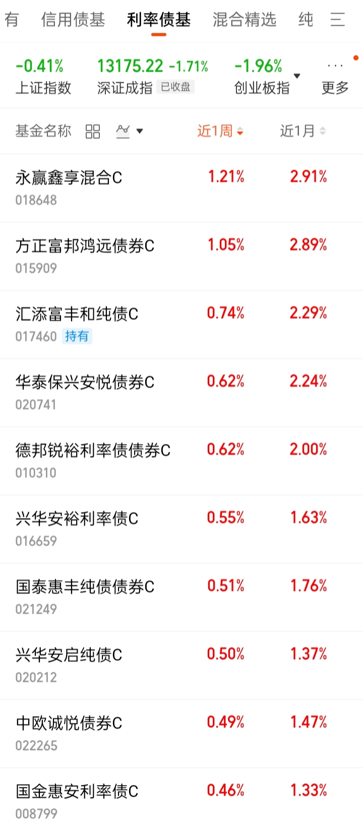 $华泰保兴安悦债券C(OTCFUND|020741)$。$东方添益债券(OTCFUND|400030)$。$华泰保兴安悦债券A(OTCFUND|007540)$ 。$鹏华丰禄债券(OTCFUND|003547)$。$方正富邦鸿远债券C(OTCFUND|015909)$。$永赢稳健增强债券C(OTCFUND|014089)$。$国泰惠丰纯债债券A(OTCFUND|007214)$。$博时恒乐债券C(OTCFUND|014847)$。$易方达增强回报债券A(OTCFUND|110017)$。$南方中债7-10年国开行债券指数E(OTCFUND|013594)$