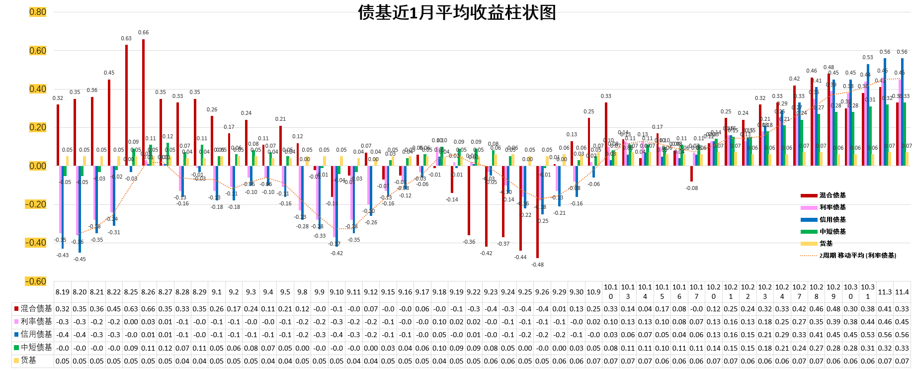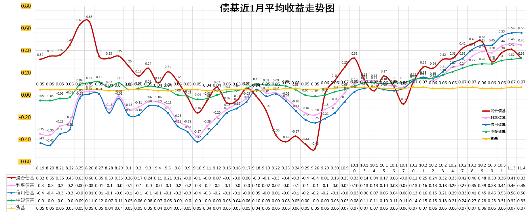 6、债基近1周平均收益为0.18%至0.09%,由高位区下降到中位区-低位区。债基近1月平均收益为0.56%至0.33%,位于中高位区。