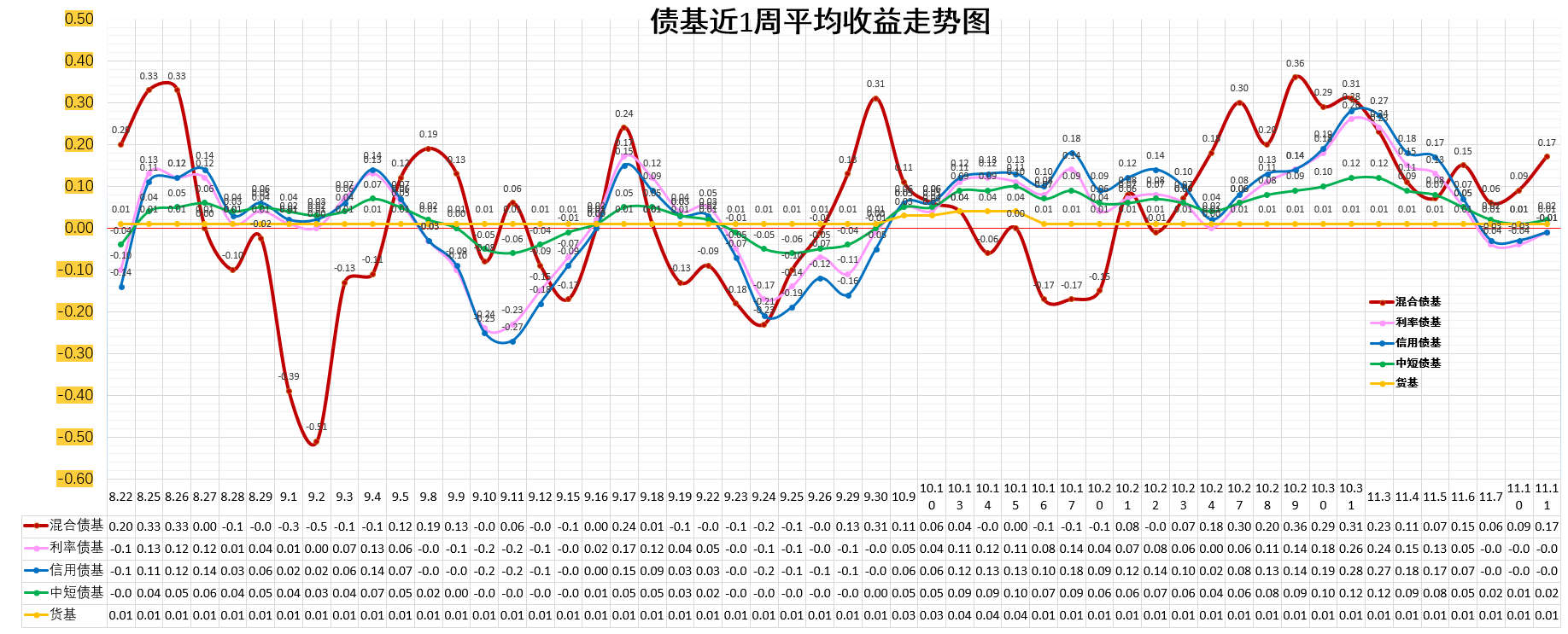 利率债基:-0.01%。低于货基,与信用债基持平。