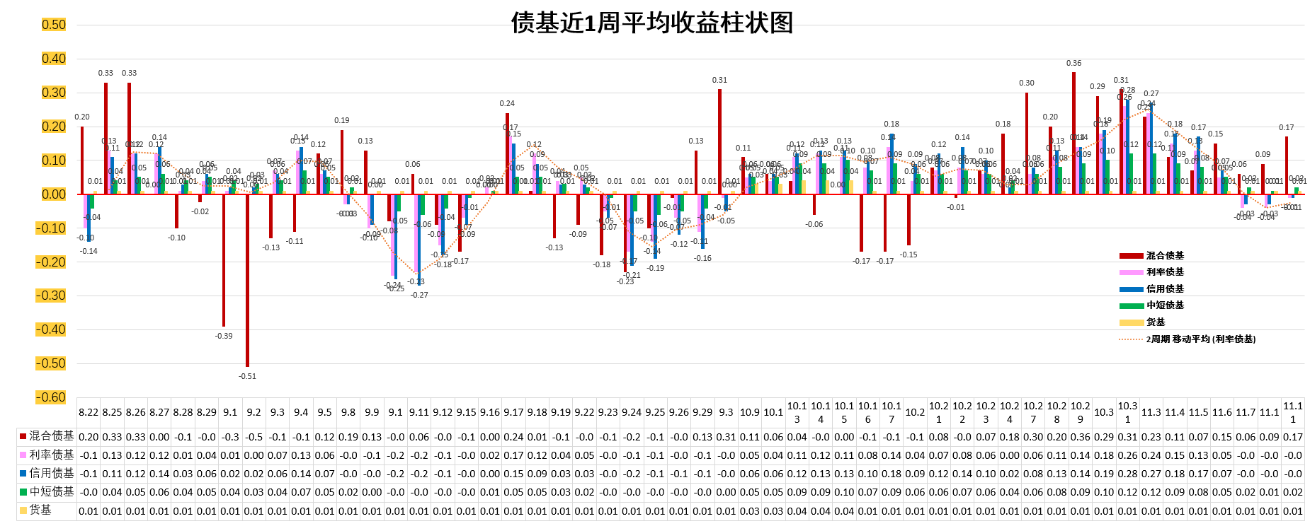 3、近1周平均收益排序:混合债基>中短债基>货基>信用债基=利率债基。