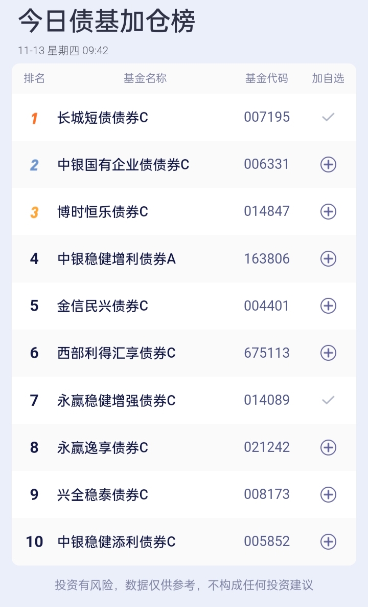 $华泰保兴安悦债券C(OTCFUND|020741)$。$鹏华丰禄债券(OTCFUND|003547)$。$南方中债7-10年国开行债券指数A(OTCFUND|006961)$。$永赢鑫欣混合C(OTCFUND|018603)$。$富国优化增强债券E(OTCFUND|018980)$。$易方达增强回报债券A(OTCFUND|110017)$。$方正富邦鸿远债券C(OTCFUND|015909)$。$东方添益债券(OTCFUND|400030)$。$永赢先进制造智选混合发起C(OTCFUND|018125)$。$华泰保兴安悦债券A(OTCFUND|007540)$