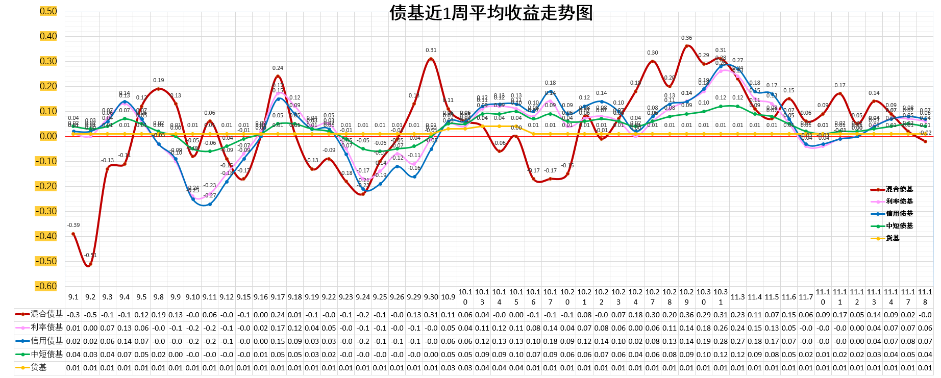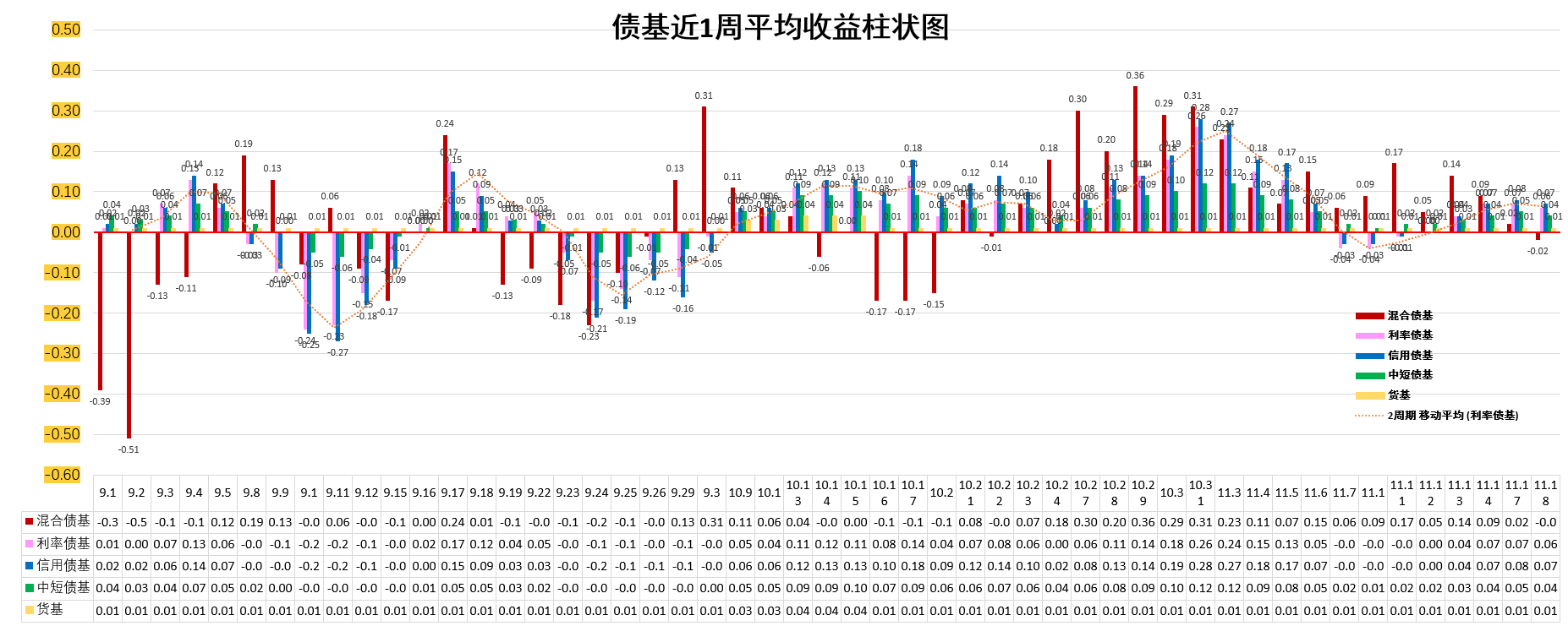 3、近1周平均收益排序:信用债基>利率债基>中短债基>货基>混合债基。