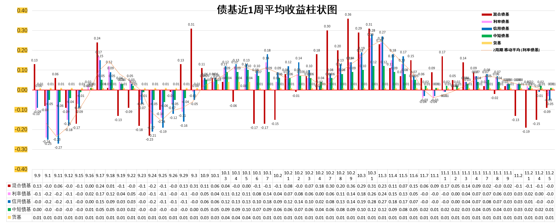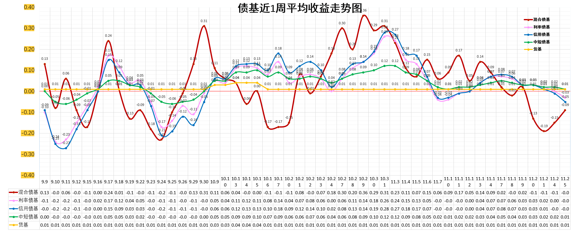 2、混合债基近1周平均收益低于货基,低于债基。利率债基近1周平均收益高于信用债基。