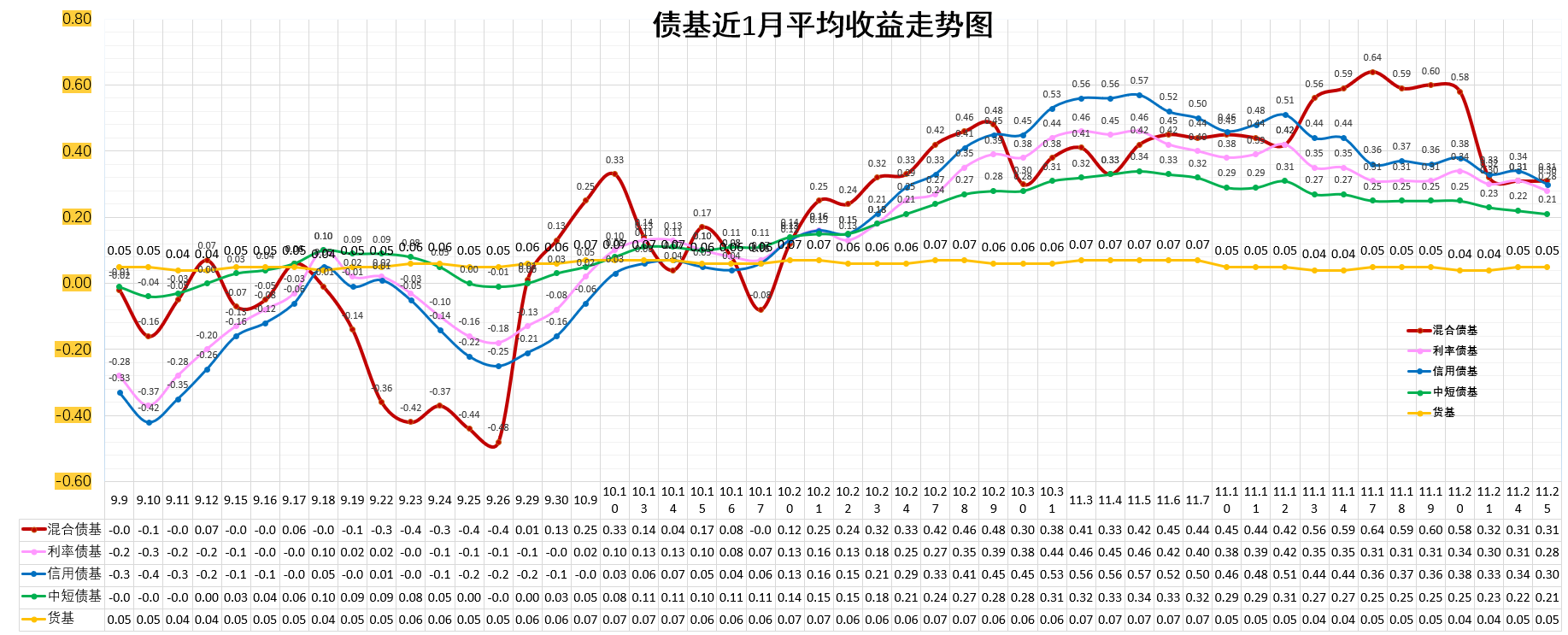 混合债基(混合一级):-0.09%。低于货基,低于债基。