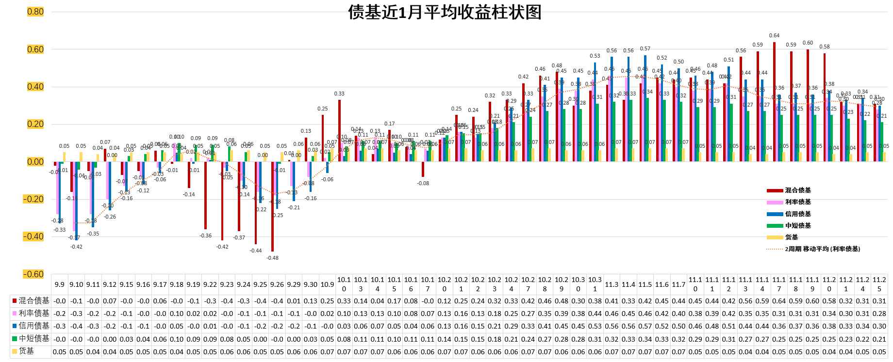 3、近1周平均收益排序:货基>中短债基>利率债基>信用债基>混合债基。