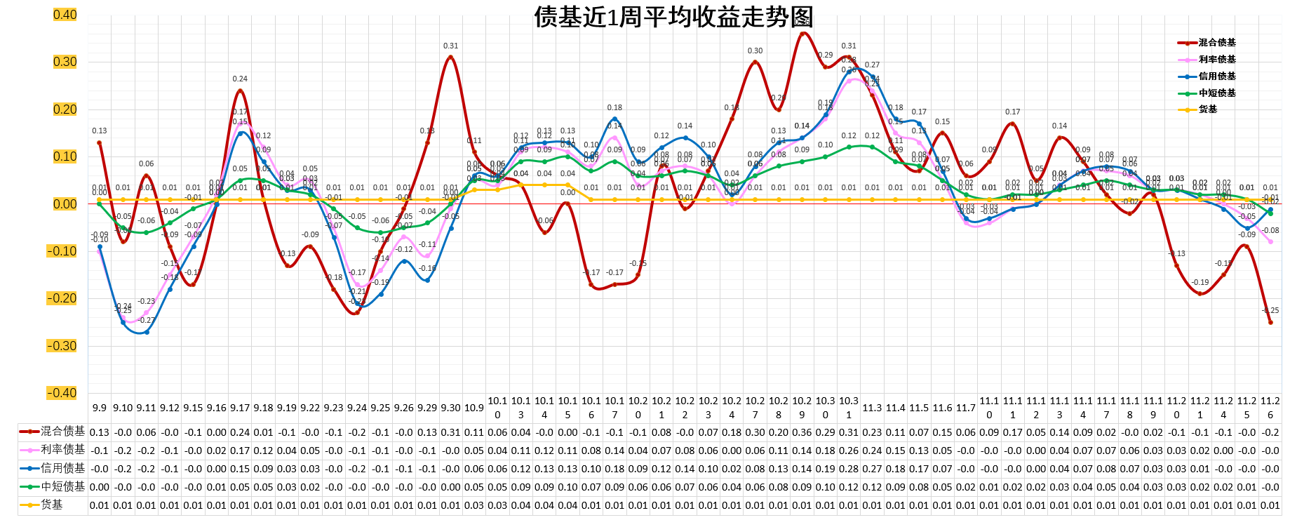 混合债基(混合一级):-0.25%。低于货基,低于债基。