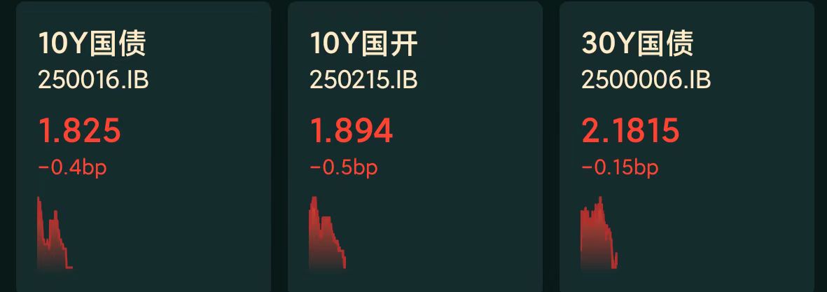 十年期国债收益率:1.825%,-0.4BP(国债收益率越跌,债市越涨)