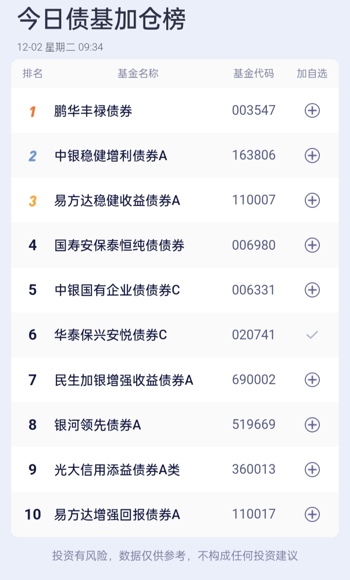 $华泰保兴安悦债券C(OTCFUND|020741)$。$南方中债7-10年国开行债券指数A(OTCFUND|006961)$。$永赢稳健增强债券C(OTCFUND|014089)$。$富国优化增强债券E(OTCFUND|018980)$。$易方达增强回报债券A(OTCFUND|110017)$。$方正富邦鸿远债券C(OTCFUND|015909)$。$东方添益债券(OTCFUND|400030)$。$广发上海金ETF联接C(OTCFUND|008987)$。$广发纳斯达克100ETF联接人民币(QDII)C(OTCFUND|006479)$。$天弘恒生科技ETF联接C(OTCFUND|012349)$