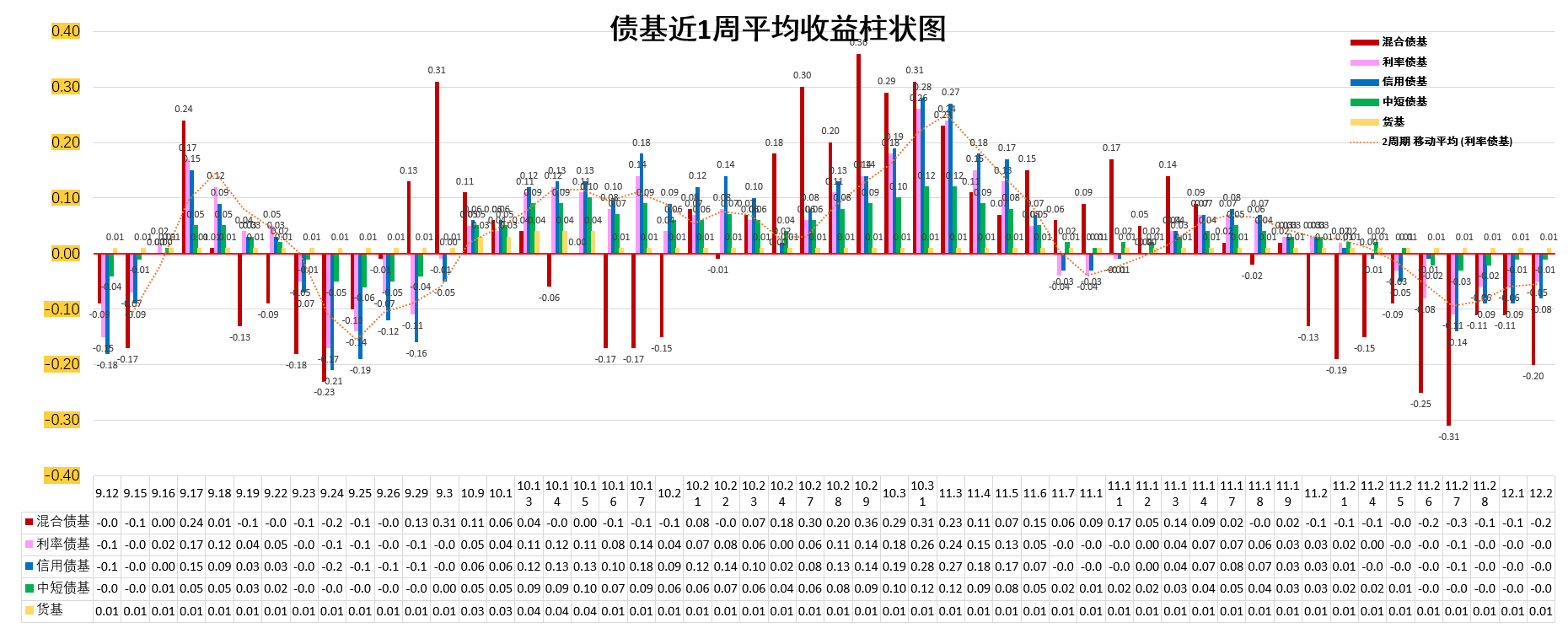 3、近1周平均收益排序:货基>中短债基>利率债基>信用债基>混合债基。