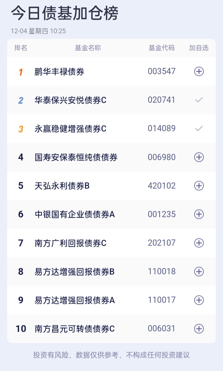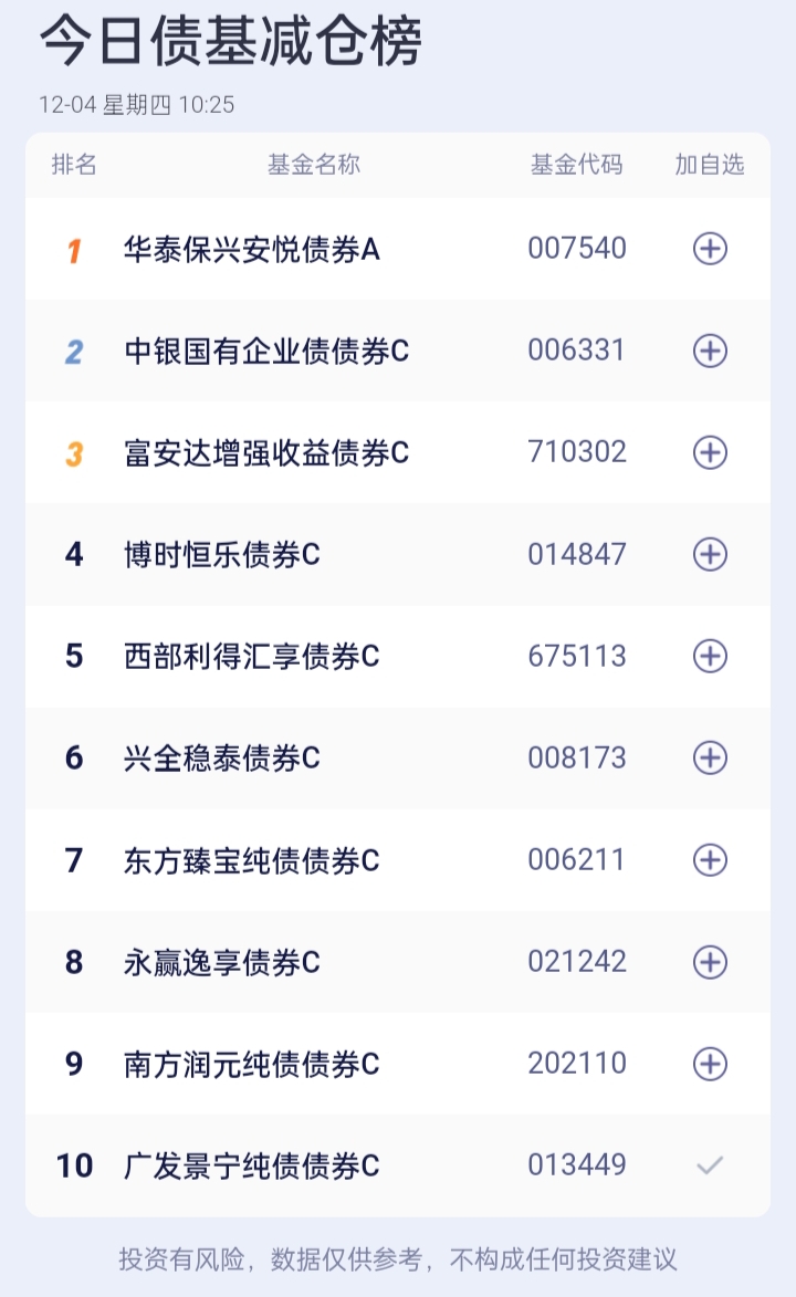 $华泰保兴安悦债券C(OTCFUND|020741)$ 。$南方中债7-10年国开行债券指数A(OTCFUND|006961)$ 。$永赢稳健增强债券C(OTCFUND|014089)$ 。 $富国优化增强债券E(OTCFUND|018980)$ 。$易方达增强回报债券A(OTCFUND|110017)$ 。$方正富邦鸿远债券C(OTCFUND|015909)$ 。$东方添益债券(OTCFUND|400030)$ 。$华泰保兴安悦债券A(OTCFUND|007540)$ 。$长城短债C(OTCFUND|007195)$ 。$南方中债7-10年国开行债券指数E(OTCFUND|013594)$
