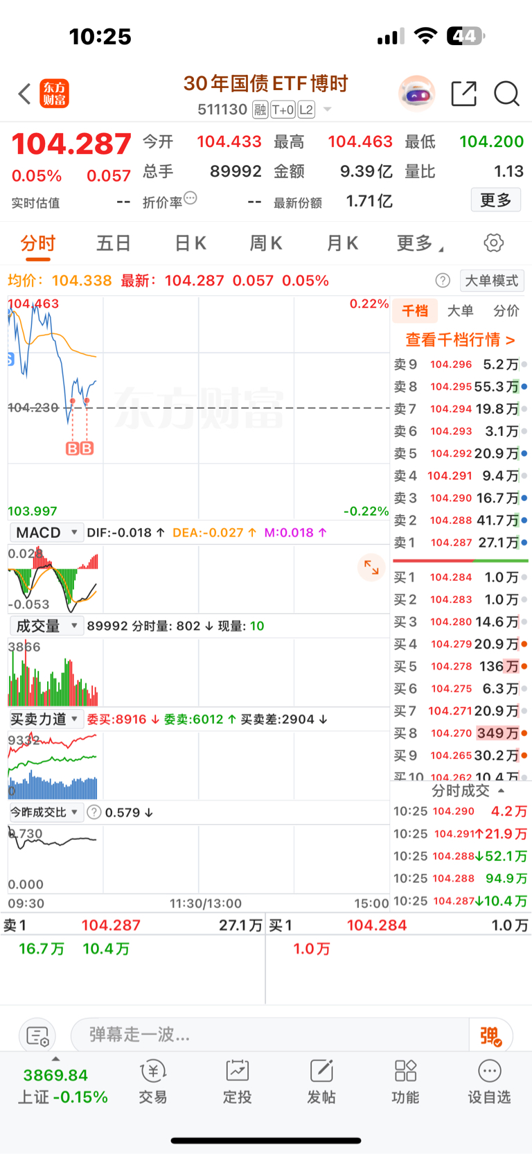 $30年国债ETF博时(SH511130)$ 这个国债讲究个快进快出,一不留神就得被套,做T其乐无穷