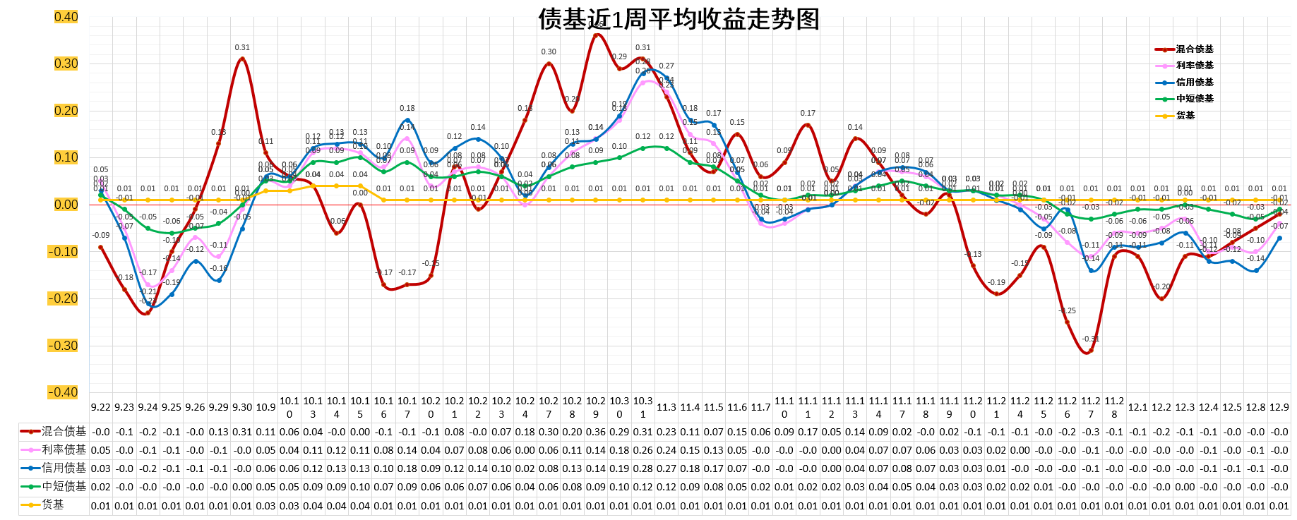 混合债基近1周平均收益小幅上升,仍低于货基,高于债基,逢低买入。