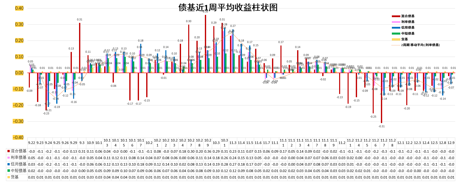 2、混合债基近1周平均收益低于货基,高于债基。利率债基近1周平均收益高于信用债基。