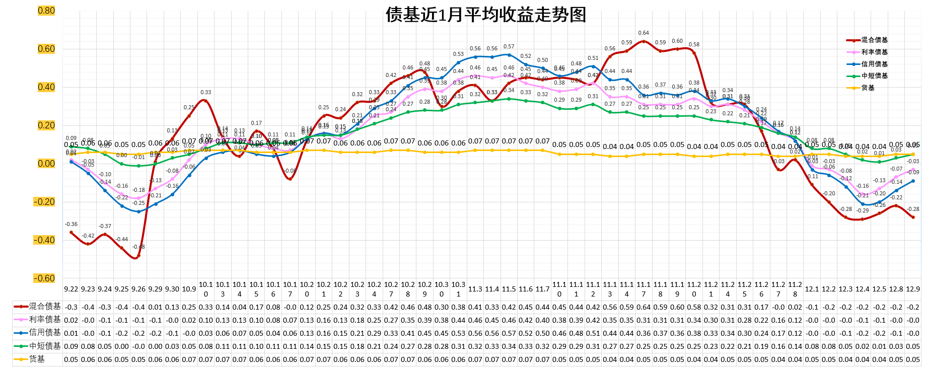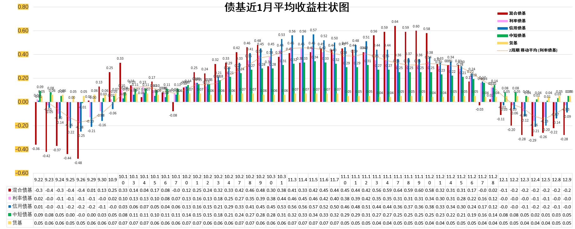 5、债基近1 周平均收益与前一天相比大幅上升。 债基近1 月平均收益与前一天相比大幅上升。混合债基近1周平均收益与前一天相比小幅上升。