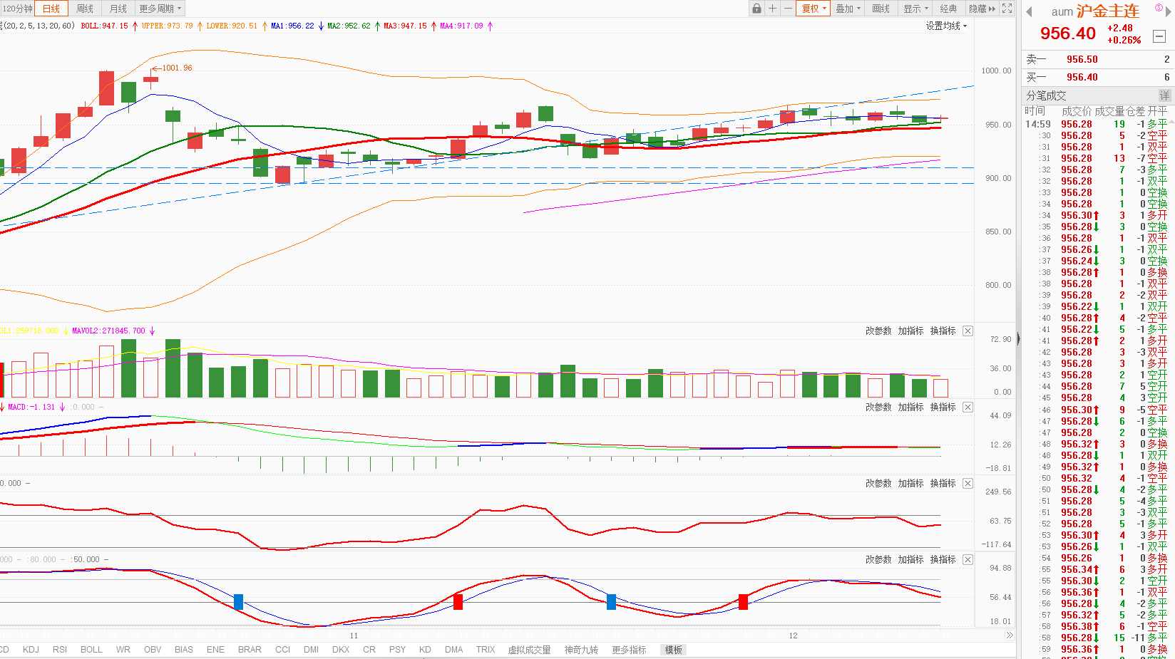 沪金主连:涨0.26%,日K线在5日均线之上。今天沪金上涨,日K 线在5日均线上下震荡,