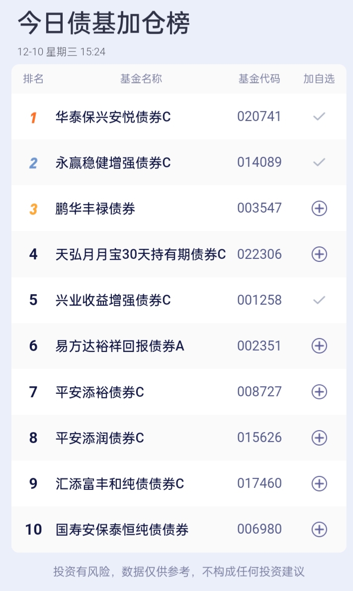 $华泰保兴安悦债券C(OTCFUND|020741)$。$易方达增强回报债券A(OTCFUND|110017)$。$华泰保兴安悦债券A(OTCFUND|007540)$。$永赢稳健增强债券C(OTCFUND|014089)$。$东方添益债券(OTCFUND|400030)$。$方正富邦鸿远债券C(OTCFUND|015909)$。$长城短债C(OTCFUND|007195)$。$广发中债7-10年国开债指数E(OTCFUND|011062)$ 。$博时恒乐债券C(OTCFUND|014847)$。$广发上海金ETF联接C(OTCFUND|008987)$