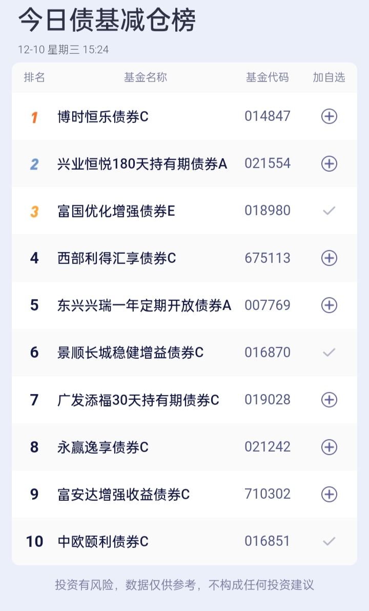 八、债券基金加、减仓榜(截止到15:00收盘)