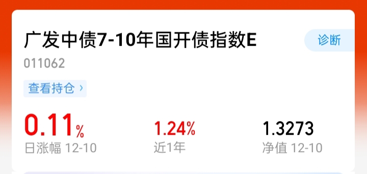今天广发中债7-10收11蛋,已连续2天收恐龙蛋,4天仅1天回撤,近1周表现优秀!广发7-10年为老牌绩优利率债基,主投国开债,进攻性强。上市以来21个季度荣获晨星5星评级,连续7年实现正收益,能涨抗跌,调整后修复速度快,净值屡创新高。近1年涨幅达1.24%。业绩锐度是7-10年里面最高的,热度和业绩都很好!