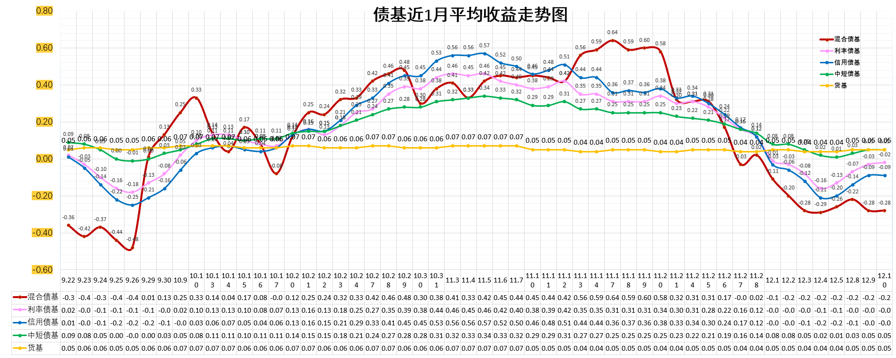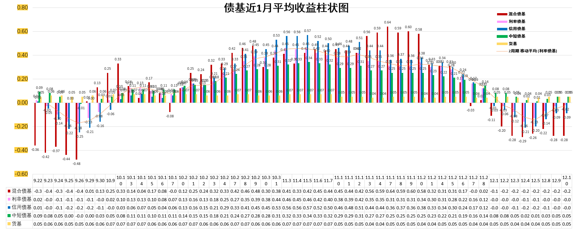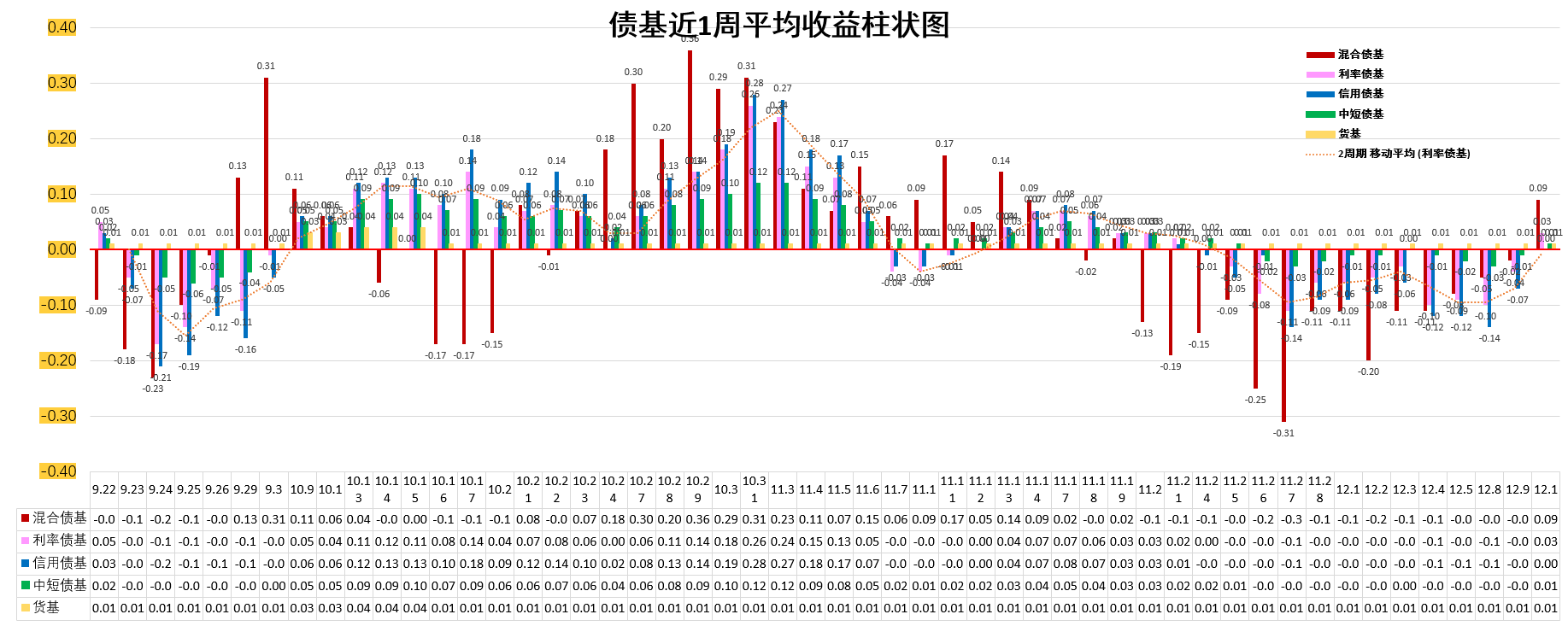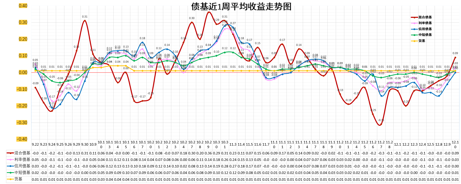 3、近1周平均收益排序:混合债基>利率债基>货基>中短债基>信用债基。
