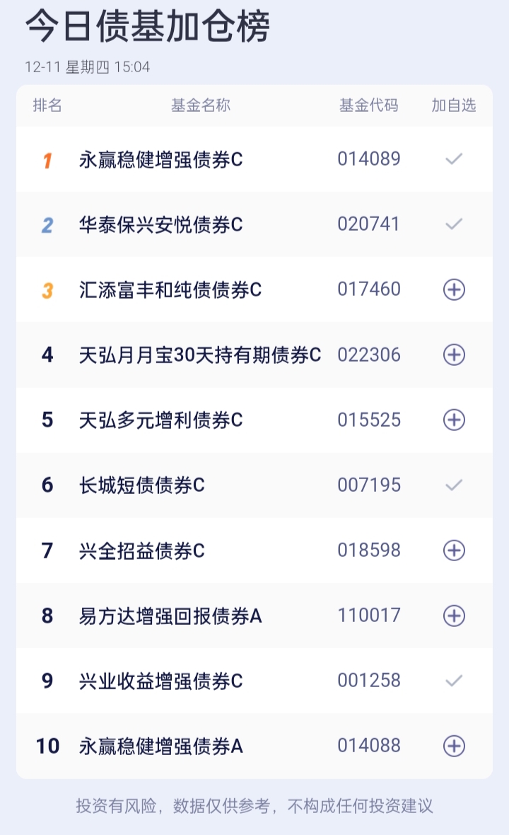 $华泰保兴安悦债券C(OTCFUND|020741)$。$易方达增强回报债券A(OTCFUND|110017)$。$华泰保兴安悦债券A(OTCFUND|007540)$。$永赢稳健增强债券C(OTCFUND|014089)$。$东方添益债券(OTCFUND|400030)$。$方正富邦鸿远债券C(OTCFUND|015909)$。$长城短债C(OTCFUND|007195)$。$广发中债7-10年国开债指数E(OTCFUND|011062)$ 。$博时恒乐债券C(OTCFUND|014847)$。$南方中债7-10年国开行债券指数E(OTCFUND|013594)$
