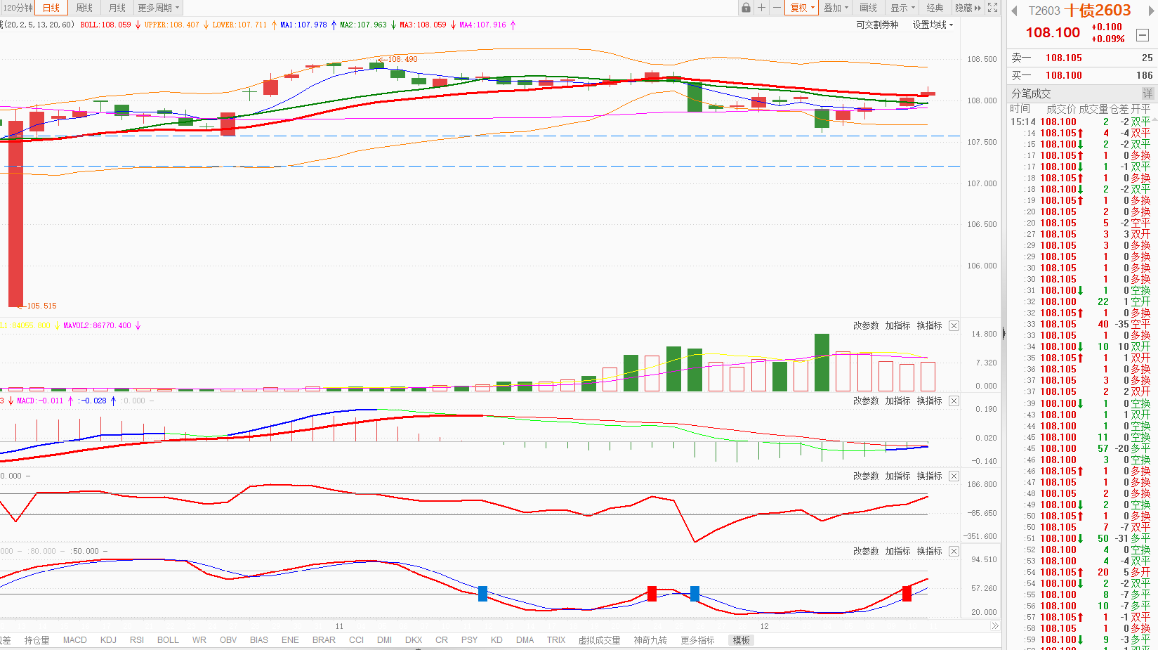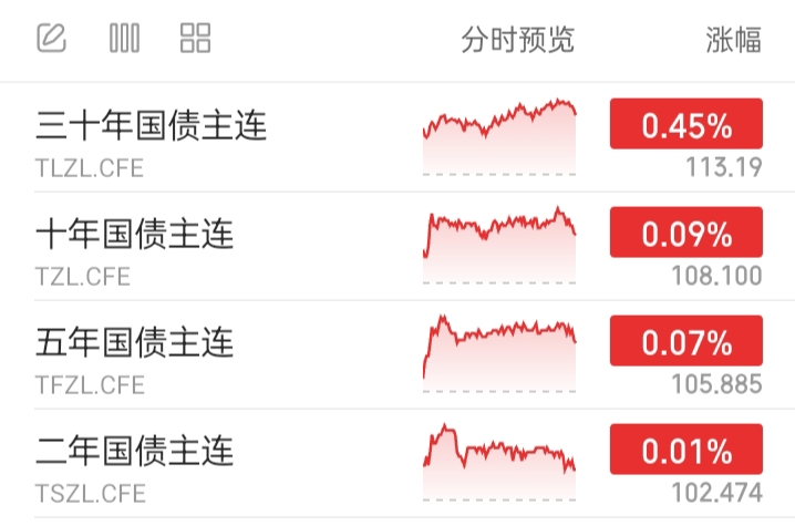 今天国债期货日K线收盘后全部在5日均线之上,整体走势较强。