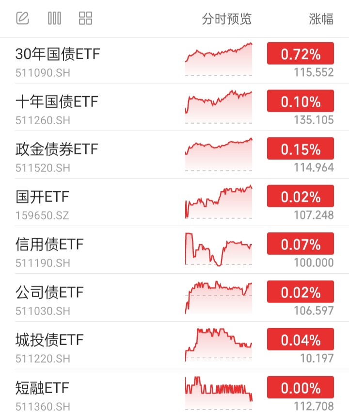 信用债ETF、公司债ETF、城投债ETF,代表信用债基。全部上涨