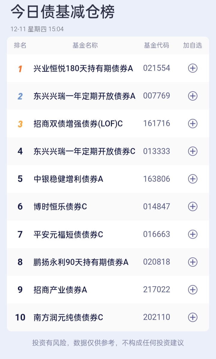 八、债券基金加、减仓榜(截止到15:00收盘)