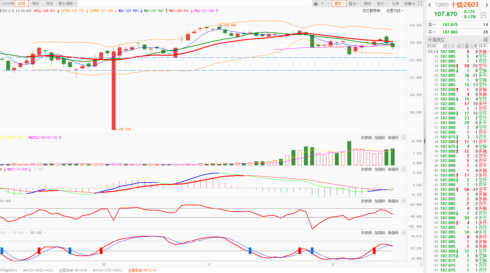 今天10年国债期货平开高走,跌0.12%,日K线在5日均线之下。