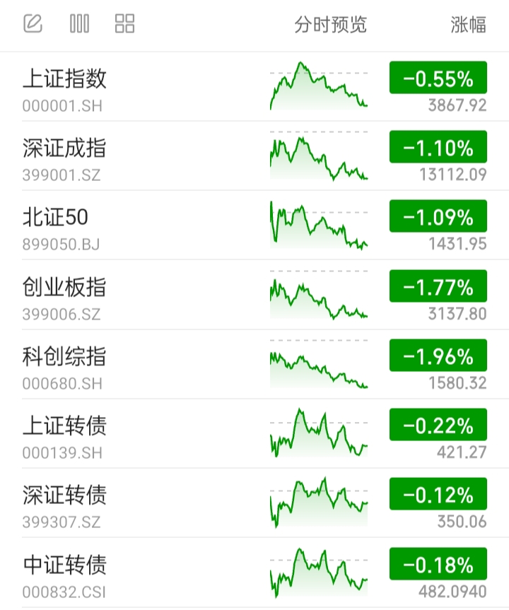 A股市场重要指数:全部下跌。今天偏股混基可能下跌。