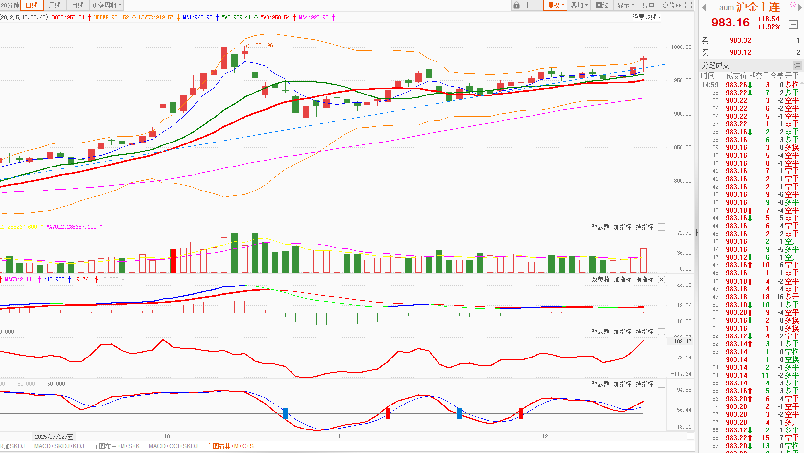 沪金主连:涨1.92%,日K线在5日均线之上。今天沪金继续上涨,日K 线站上布林线上轨,布林线开口向上,MACD、KDJ双金叉,走势较强,后市可能继续震荡上行。