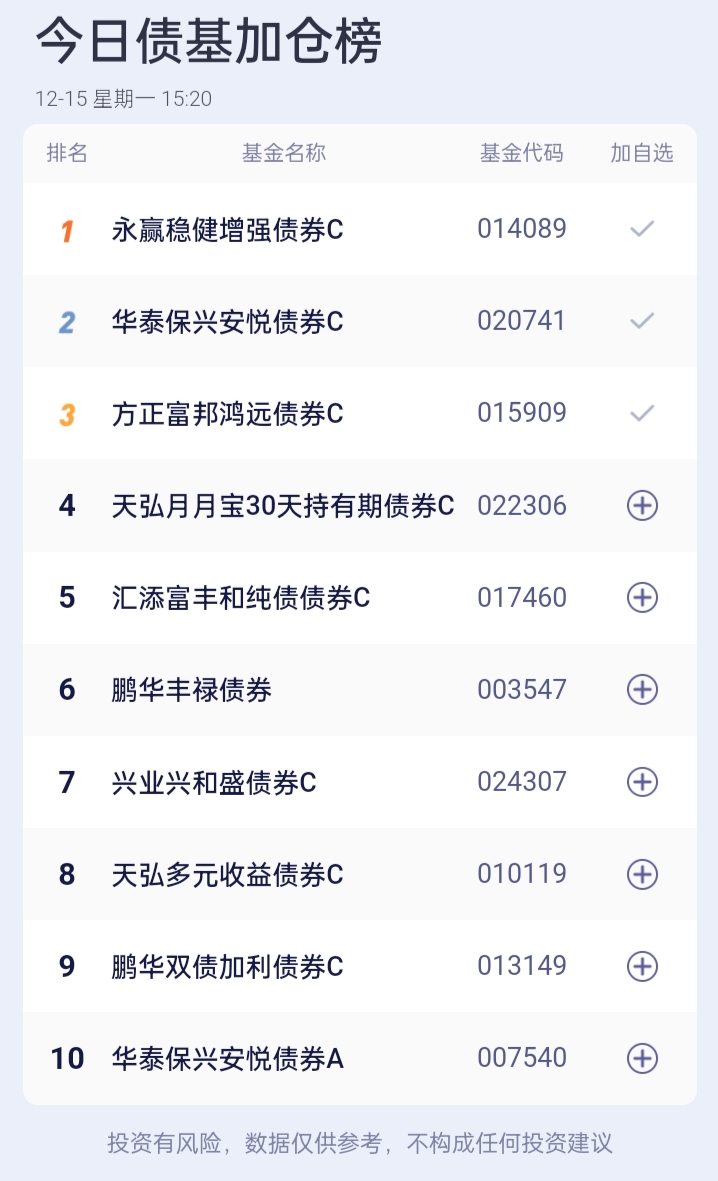 $华泰保兴安悦债券C(OTCFUND|020741)$。$易方达增强回报债券A(OTCFUND|110017)$。$华泰保兴安悦债券A(OTCFUND|007540)$。$永赢稳健增强债券C(OTCFUND|014089)$。$东方添益债券(OTCFUND|400030)$。$方正富邦鸿远债券C(OTCFUND|015909)$。$长城短债C(OTCFUND|007195)$。$广发中债7-10年国开债指数E(OTCFUND|011062)$ 。$博时恒乐债券C(OTCFUND|014847)$。$南方中债7-10年国开行债券指数E(OTCFUND|013594)$