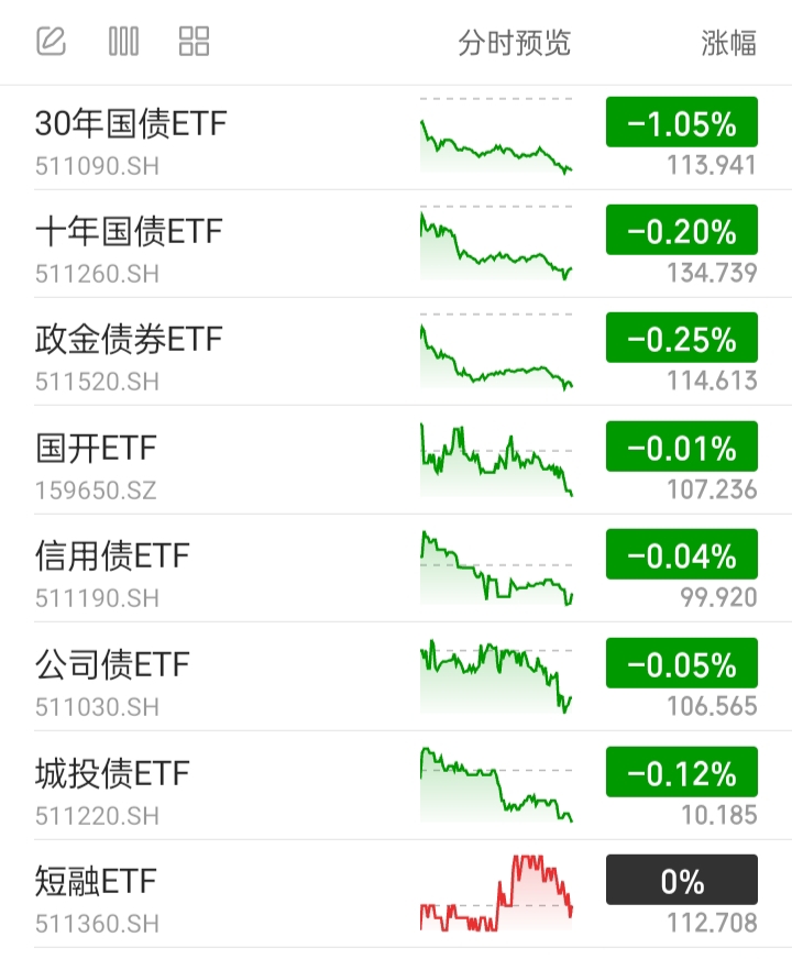 信用债ETF、公司债ETF、城投债ETF,代表信用债基。全部下跌