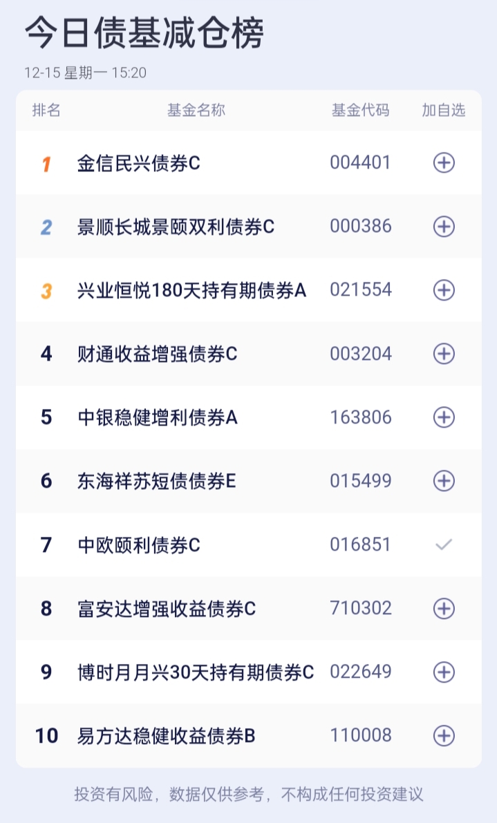 八、债券基金加、减仓榜(截止到15:00收盘)