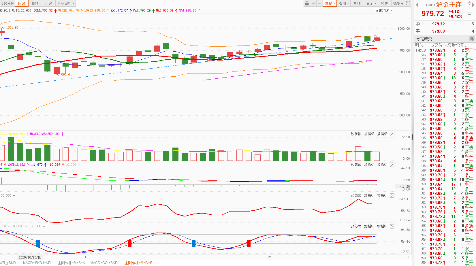 沪金主连:涨0.42%,日K线在5日均线之上。今天沪金上涨,目前仍处于强势整理阶段,震荡后可能继续小幅上行。