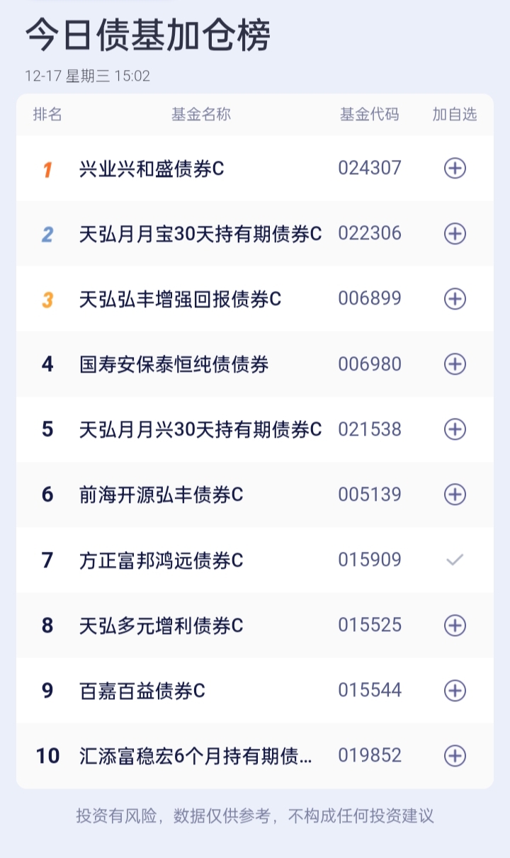 $华泰保兴安悦债券C(OTCFUND|020741)$。$易方达增强回报债券A(OTCFUND|110017)$。$华泰保兴安悦债券A(OTCFUND|007540)$。$永赢稳健增强债券C(OTCFUND|014089)$。$东方添益债券(OTCFUND|400030)$。$方正富邦鸿远债券C(OTCFUND|015909)$。$长城短债C(OTCFUND|007195)$。$广发中债7-10年国开债指数E(OTCFUND|011062)$ 。$博时恒乐债券C(OTCFUND|014847)$。$鹏华丰禄债券(OTCFUND|003547)$