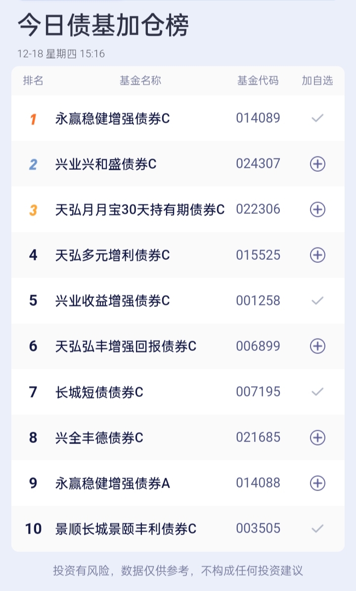 $华泰保兴安悦债券C(OTCFUND|020741)$。$易方达增强回报债券A(OTCFUND|110017)$。$华泰保兴安悦债券A(OTCFUND|007540)$。$永赢稳健增强债券C(OTCFUND|014089)$。$东方添益债券(OTCFUND|400030)$。$方正富邦鸿远债券C(OTCFUND|015909)$。$长城短债C(OTCFUND|007195)$。$广发中债7-10年国开债指数E(OTCFUND|011062)$ 。$博时恒乐债券C(OTCFUND|014847)$。$鹏华丰禄债券(OTCFUND|003547)$