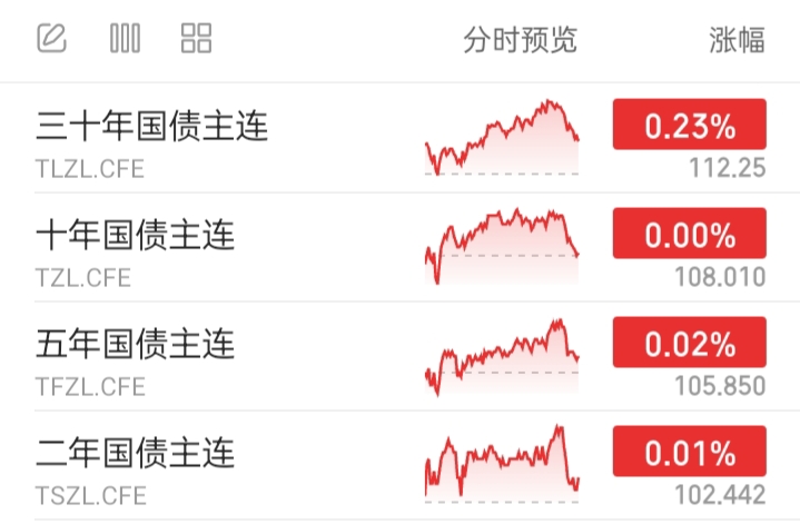 今天2年国债期货日K线收盘后在5日均线之下,5、10、30年国债期货日K线收盘后在5日均线之上,整体走势震荡偏强。